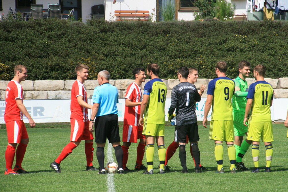 Im Bild: Man kennt sich seit Jahren. Die letzte Begegnung der „Ersten“ des Kreisklassisten ASV Michelfeld mit Betzenstein & Co war vor etwa vier Jahren: Am ersten Spieltag der „Corona-Saison“ 2019/21 am 11. August 2019 gewann der ASV gegen den FCB vor 130 Zuschauern mit 2:1. Michelfeld wurde Quotienten-Vizemeister und konnte nicht in die Kreisliga-aufsteigen, Betzenstein stieg in die A-Klasse ab.