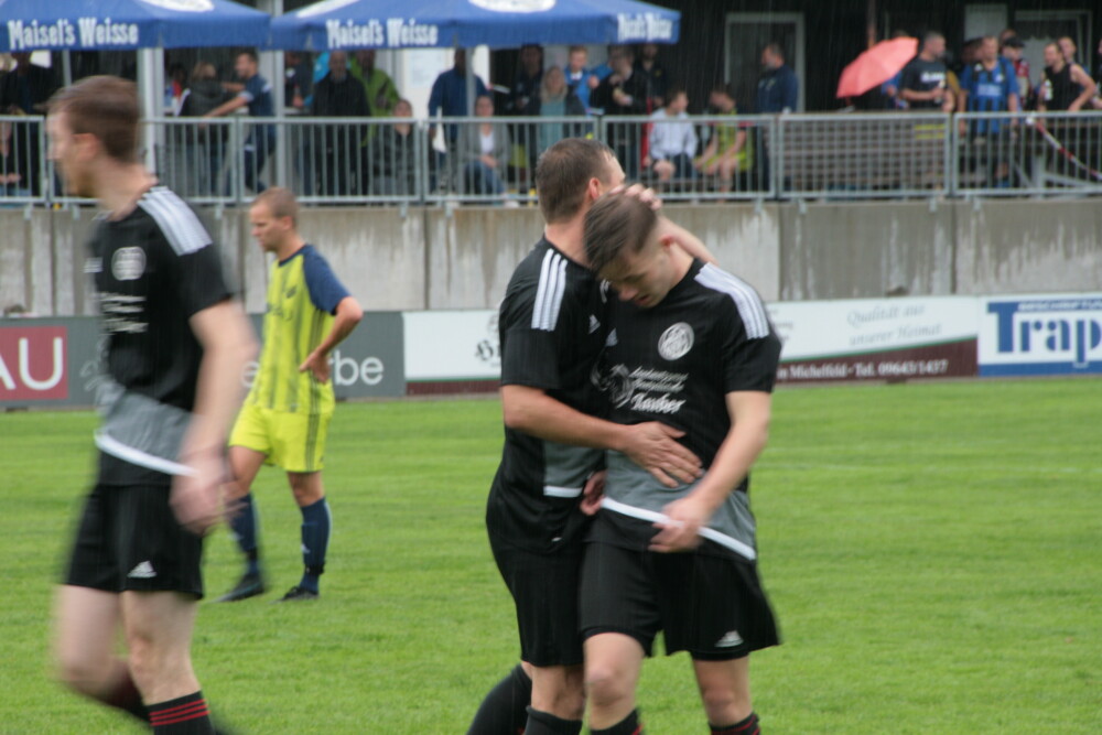 Im Bild: Vor fast exakt zwei Jahren gewann Hiltpoltstein in Michelfeld bei Dauerregen mit 0:3 – dank Jonas Tillmann (rechts im Bild, umarmt nach einem Torerfolg), der zwei Tore erzielte. Der Schiedsrichter von 2021 ist auch dieses Mal für dieses Ende-August-Match eingeteilt.