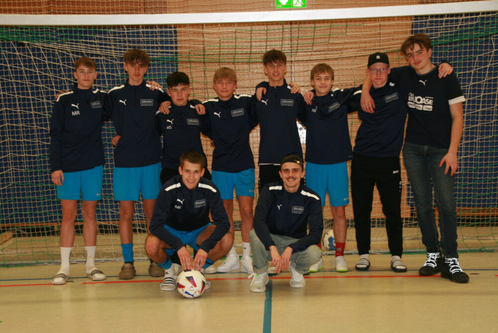 Die Fußball-B-Junioren der SG Auerbach gewannen am zweiten Tag des Jahres quasi ihr „eigenes“ Turnier – als gastgebender Veranstalter aus der U17-Kreisliga Amberg/Weiden gegen drei andere Kreisligisten und ein Team aus einer Kreisgruppe. Unten rechts ist Trainer Simon Wittmann zu sehen.