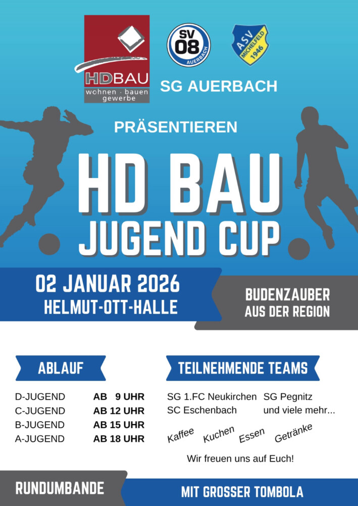 # Jugend Cup: Freitag, 2. Januar 2026, ab 9 Uhr/12 Uhr/15 Uhr/18 Uhr, Helmut-Ott-Halle, Auerbach: HD-Bau-Junioren-Cup 2026 (für Großfeld-Teams; D-, C-, B- und A-Junioren). In jeder Altersstufe wird innerhalb von drei Stunden mit sechs Teams in zwei Gruppen a drei Mannschaften gespielt. Danach folgen jeweils die Halbfinal- und Platzierungsspiele.